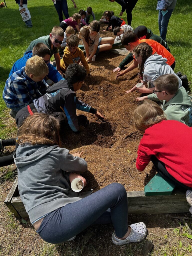 Kids gather around a large box filled with sawdust, searching for coins in the Kids’ Fortune Hunt at the most recent Farmers Antique Tractor and Engine Association show.